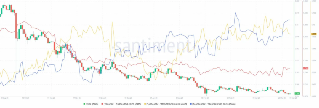 에이다(ADA) 3월 30일 0.2392달러까지 하락했다가 0.2462달러까지 회복했는데, 이는 2월 급락 이후 최저 일일 최저가입니다. 4개의 이동평균선(EMA) 모두 상공을 지나 하락 추세이며, 불 지지선은 거의 40% 가까이 떨어져 있습니다. 그럼에도 불구하고 Santiment의 고래 데이터에 따르면 최대 에이다(ADA) 보유자들은 2월 이후 꾸준히 포지션을 늘려왔습니다.
