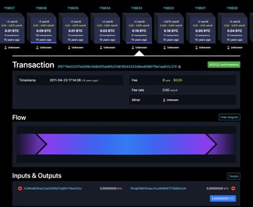 2011년 4월 23일에 전송된 이 5 비트코인(BTC) 지급은 비탈릭 부테린의 첫 번째 비트코인 수입이자 비트코인으로 지급된 가장 초기의 임금 지급 사례 중 하나로 여겨집니다.