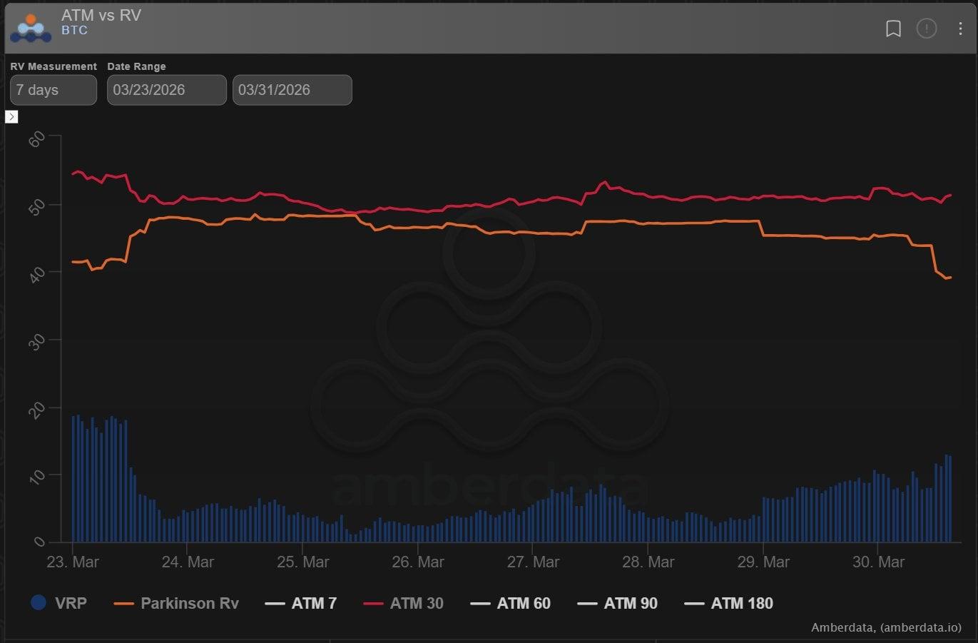 일반적으로 내재 변동성은 프리미엄이 붙어 거래되지만, 단기 7일 변동성은 글로벌 상황과 불확실성으로 인해 옵션 수요가 증가하면서 다소 높은 수준을 보이고 있습니다.