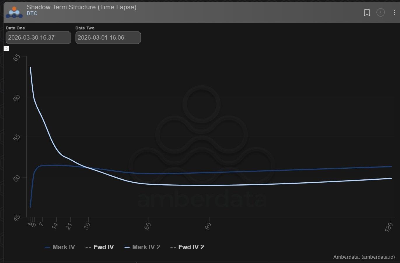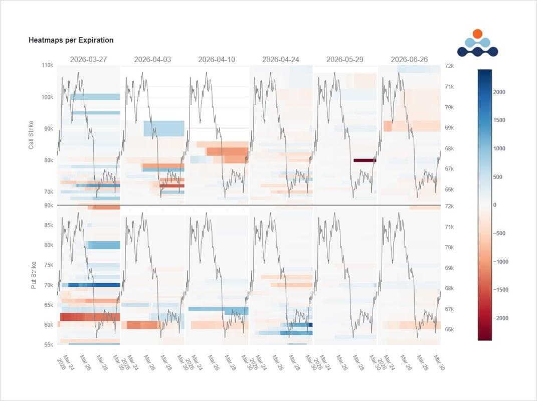 3월 27일 만기일을 세부적으로 살펴보면 일반적인 큰 그림보다 훨씬 복잡합니다. 관찰할 수 있는 것은 4월 만기일로의 일부 순환매이며, 이러한 순환매는 여전히 풋옵션에 크게 유리하다는 점입니다. 4월 만기 6만~6만 4천 달러 풋옵션과 6만 4천/6만 2천~5만 5천 달러 풋 스프레드가 매수되었습니다. 일부는 직접 매수되었고, 일부는 4월과 5월 만기 약 8만 달러 콜옵션으로 자금을 조달했습니다.
