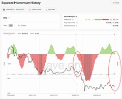 $BTC 擠壓動能表現開始回歸零軸,上一次多頭動能歸零時(一月中),BTC 價格處於上一個階段的低檔盤整後開始往下...📉,這是會一樣嗎?!👀