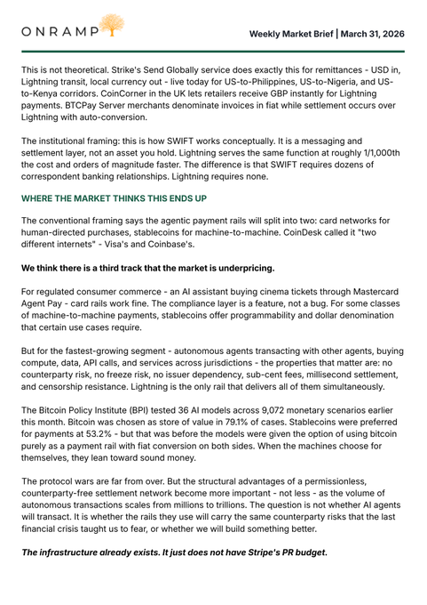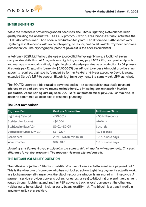 스테이블코인은 기계 상거래를 위한 "달러 API"입니다. 하지만 테더(Tether) 5천 개 주소에 걸쳐 30억 달러 이상을 동결했습니다. SVB가 실패하자 서클(Circle) 0.88달러로 고정 가격 조정을 해제했습니다. 이제 AI 에이전트가 그 철도망에서 15조 달러를 관리한다고 상상해 보세요. 라이트닝 모터는 발급자도, 허가도 필요 없습니다. ⚡️ 주간 시장 개요 👇