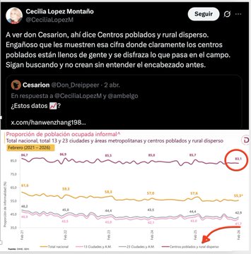 세실리아 로페즈 씨의 트윗을 검토해 보니, 그녀의 계정에서 앞뒤가 맞지 않는 부분이 있습니다. 사진 1: 그녀는 2월에 농촌 부문에서 36만 5천 개의 일자리가 사라졌고, 비공식 고용률이 84%에 달한다고 주장합니다. 저는 그녀에게 36만 5천이라는 수치의 근거를 묻고, DANE(국가통계청) 자료를 첨부했습니다. 이 자료에 따르면 작년 2월과 올해 2월 사이에 인구 밀집 지역과 분산된 농촌 지역(DANE에서 사용하는 전문 용어)의 고용 인구는 5만 6천 명 증가했습니다. 사진 2: 세실리아는 일자리 감소 주장의 증거로 "농업, 축산, 수렵, 임업 및 어업" 부문의 고용 인구가 36만 3천 명 감소했다는 자료를 제시했습니다. 설령 이 활동에 종사하는 사람들의 100%가 농촌 지역에 있다고 가정하더라도, 농촌 지역의 모든 사람들이 이 분야에 종사한다는 의미는 아닙니다. 이 활동과 농촌 지역 사이에 직접적인 연관성은 없지만, 뭐 어쨌든… 하지만 세실리아의 모순은 다음과 같습니다. 사진 3: 제가 DANE(국가통계행정국)에서 가져온 스크린샷을 인용한 트위터 사용자에게 답글을 달면서, 세실리아는 인구 밀집 지역을 농촌 지역에 포함시키는 것은 오해의 소지가 있다고 말했습니다. 여기서 제 질문은 다음과 같습니다. 만약 그것이 오해의 소지가 있다면, 왜 원래 트윗에서 "인구 밀집 지역과 분산된 농촌 지역"에 정확히 해당하는 84%의 농촌 비공식 고용률을 인용했을까요? 세실리아는 84%의 비공식 고용률 수치는 유용하다고 생각하면서도, 동일한 인구 집단을 나타내는 5만 6천 명의 고용 증가 수치는 무시하는 것 같습니다! 제가 틀렸을 거예요. 콜롬비아 농업농촌개발부 장관을 9개월 동안 지낸 사람이라면 농촌 지역과 관련된 모든 것에 대해 아주 잘 알고 있어야 하지 않을까요?