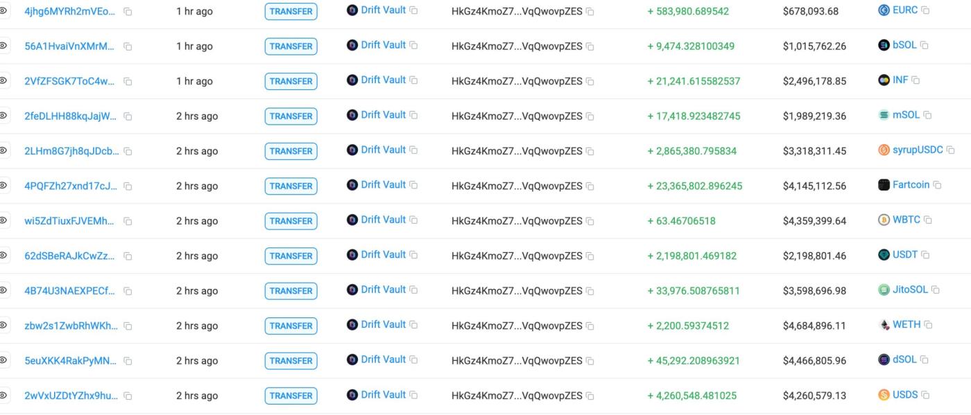 공격은 4월 2일 새벽에 시작되었습니다. 온체인 모니터링 플랫폼인 PeckShield는 Drift 메인 볼트 주소에서 새로 생성된 지갑인 HkGz4K로 대규모 자금 이체가 시작되었다는 경고를 발표했습니다. 초기 이체는 주로 JLP(Jito Liquidity Provider) 토큰으로 구성되었으며, 그 가치는 약 1억 5,500만 달러에 달했습니다. 이후 USDC, SOL, cbBTC, wBTC, WETH 및 일부 밈 코인이 이체되었습니다.
