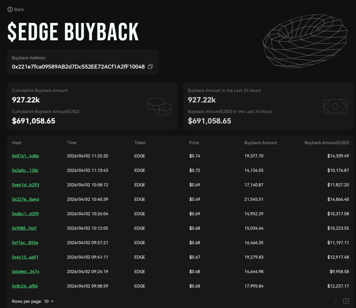 4월 1일 오후, edgeX가 시장 정서 안정시키기 위해 토큰 매입을 시작했다고 발표한 점을 언급할 필요가 있습니다. 현재까지 총 927,000개의 토큰을 매입했으며, 이는 약 69만 달러에 해당합니다.