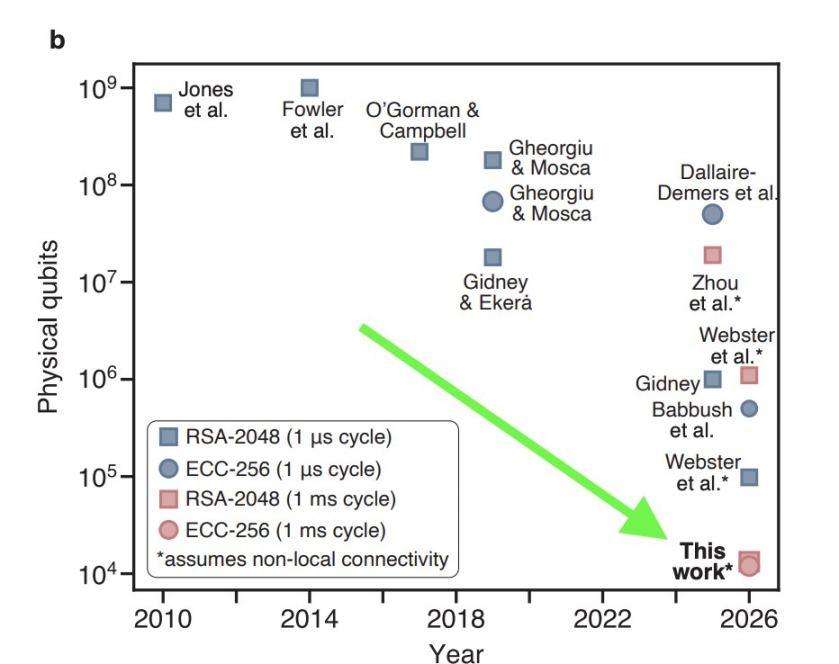 - ECDSA를 위한 매우 효율적인 쇼어 알고리즘이 구현되었으며, 이 알고리즘은 약 1200~1400개의 논리 큐비트만 필요로 합니다. ECDSA는 비트코인을 보호하는 핵심 암호화 알고리즘으로, 업계에서는 이전에 약 10,000개의 논리 큐비트가 필요할 것으로 추정했습니다. 이번 성과는 효율성을 10배 향상시킨 것입니다.