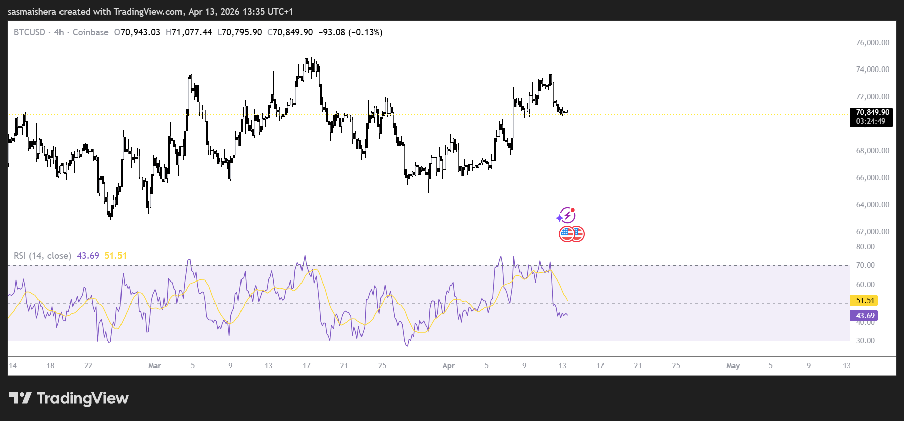 일봉 캔들이 70,700달러 부근의 50일 이동평균선(EMA) 위에서 마감되면 72,500달러 이상으로 상승할 가능성이 있습니다.