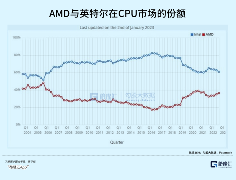 패스마크(Passmark) 데이터 모니터링에 따르면, 데이터센터 시장에서 AMD의 점유율 지난해 20%까지 급등해 인텔의 점유율(2022년 70.77%)의 10% 가까이를 빼앗았다.올해 1월 2일 기준 AMD는 40%에 가까워졌다. , 2004년 수준으로 돌아갑니다.