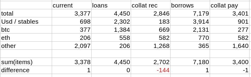 “담보 Rec.” 열 합계는 다른 4개 항목의 합계가 아닙니다. 총계는 반올림하여 파일에 제공된 다른 열 및 다른 날짜와 일치합니다. 또한 두 번째 테이블은 다른 형식이라는 점에 유의하세요. 이게 진짜 내부 보고서인가요?