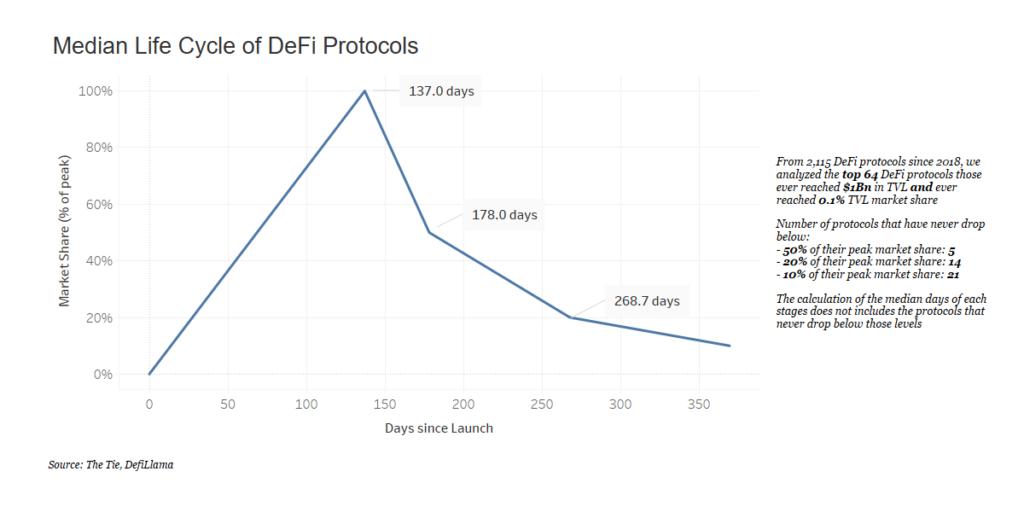 이러한 64개 상위 DeFi 프로토콜 중에서도 보유 유동성(TVL)으로 측정했을 때 수명 주기는 상대적으로 짧습니다. 유동성과 커뮤니티 참여가 탄력을 받으면 일반적으로 최대 TVL 시장 점유율(%)에 도달하는 데 3~4개월이 걸립니다. 그러나 다음 한두 달 동안 시장 점유율은 급격히 감소하여 1년 이내에 최대 유동성 시장 점유율의 10%에 도달하는 경우가 많습니다.