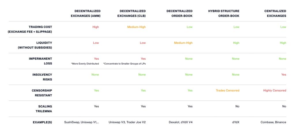 유동성 인센티브 프로그램이 종료되면 거래 수수료만으로는 많은 유동성 공급자가 자금을 풀에 보관하도록 유도하기에 충분하지 않습니다. AMM DEX의 낮은 자본 효율성과 유동성 손실로 인해 높은 슬리피지가 발생했습니다. 이는 결국 온체인 거래 비용을 중앙 집중식 거래소의 거래 비용보다 상대적으로 높게 만듭니다.