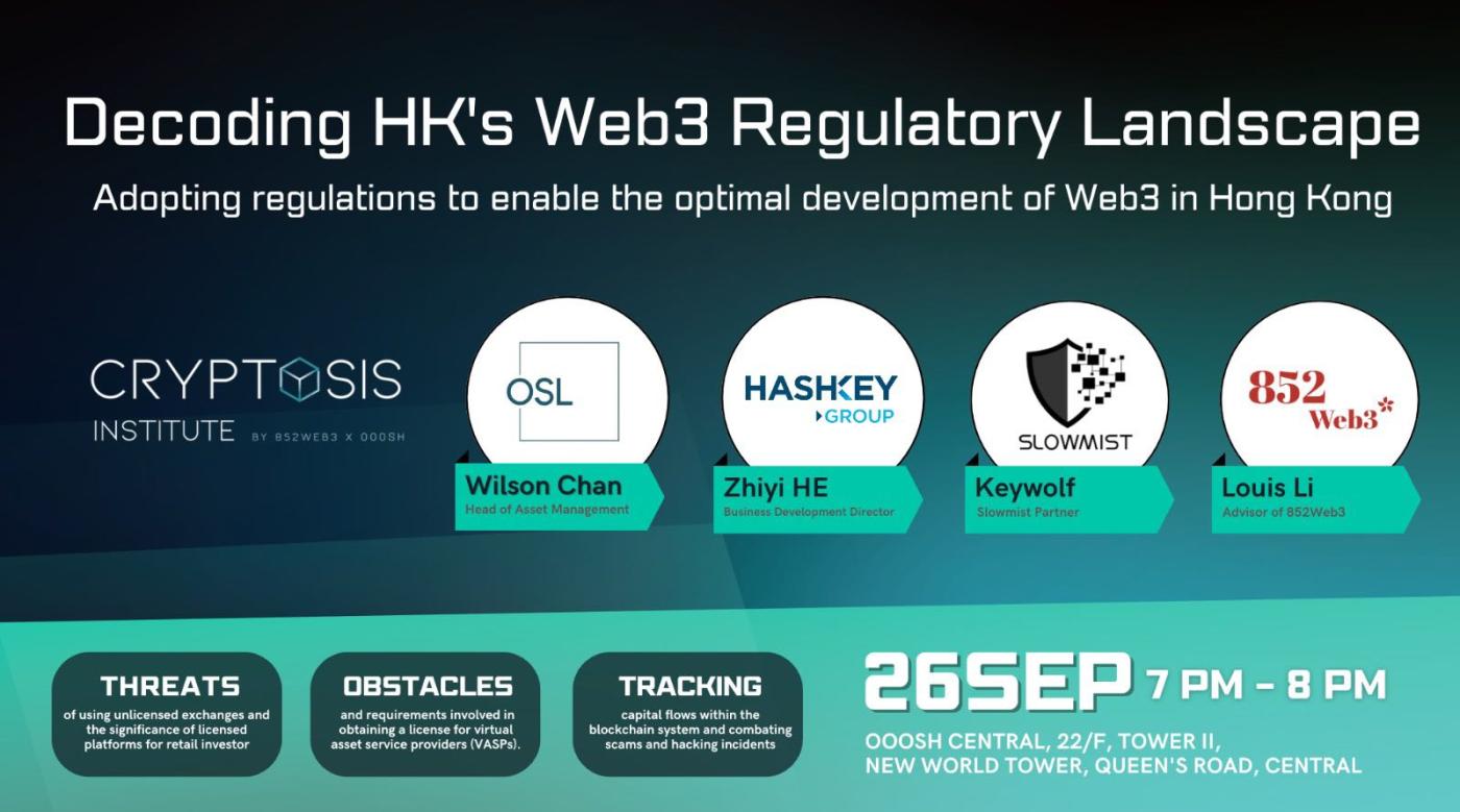 Cryptosis Institute는 9월 26일 오후 7~8시 홍콩 센트럴에 위치한 Ooosh Cenral에서 "홍콩 Web3의 규제 환경 디코딩: 규정 준수 및 합법성을 통해 홍콩 Web3의 최상의 개발 촉진"이라는 주제로 오프라인 토론 행사를 개최합니다. 게스트로는 OSL 자산 관리 책임자인 Wilson Chan, Hashkey Group의 비즈니스 개발 이사인 Zhiyi HE, Slowmist의 파트너인 Keywolf, 852Web3의 컨설턴트인 Louis Li가 있습니다.