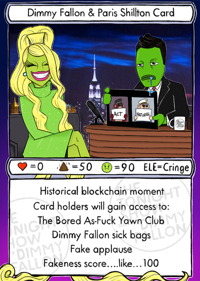CRINGEPEPE by @viva_la_vandal 패리스 힐튼이 지미 팰런의 악명 높은 '인터뷰'에서 새로운 BAYC에 대해 이야기하는 장면에서, 이 프로젝트를 과대 포장하기 위해 문페이가 제공했다는 사실을 언급하지 않는 등 PFP 선물에 열광하는 장면의 정점을 포착합니다. pepe.wtf/asset/CRINGEPEPE...