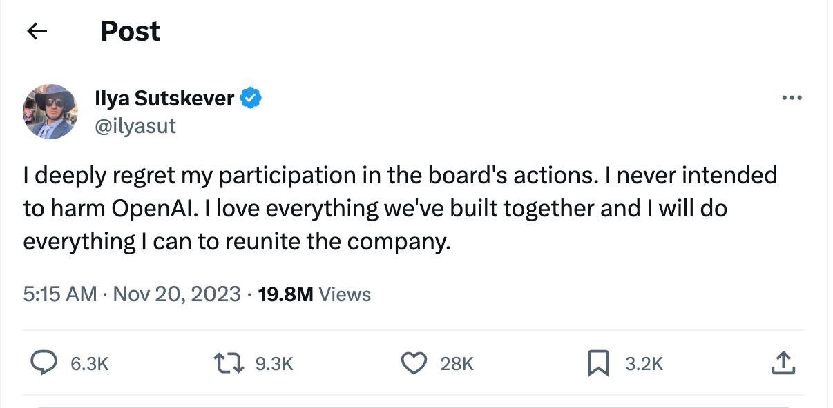 정말 미친 주말이에요 !! OpenAI 전설은 계속됩니다. 토요일 저녁에는 OpenAI 직원이 주도하여 Sam Altman과 Greg Brockman을 다시 데려오려는 노력이 있었습니다. 분명히 대부분의 직원은 Sam과 Greg의 편을 들었습니다. OpenAI에서 일했던 친구가 있습니다. 그는 정말 즐거운 시간을 보내고 있었습니다. 팀, 작업, 영향. 모두 훌륭합니다. 이번 이사회 싸움은 큰 충격이었고 대부분의 직원들은 이러한 혼란을 인정하지 않았습니다. 그러나 이사회는 열심히 노력하여 결국 새로운 임시 CEO인 Emmett Shear를 고용했습니다 . 몇 시간 내에 수백 명의 OpenAI 직원이 그만 두었습니다. Sam Altman과 Greg Brockman은 Microsoft에 합류하여 새로운 AI 연구 부서를 시작할 예정이며 Microsoft는 현재 모든 OpenAI 직원에게 제안을 확장하고 있습니다. 현재 OpenAI 직원 770명 중 700명이 회사를 그만뒀다 . 얼마나 많은 직원이 Microsoft에 합류할지는 확실하지 않습니다. 또 다른 큰 반전은 보드 싸움을 시작한 OpenAI의 공동 창립자이자 수석 과학자인 Ilya Sutskever가 보드 싸움에 *참여*한 것을 깊이 후회한다고 말하면서 뒤집혔다는 것입니다. 그 사람이 싸움을 시작한 사람 아닌가요? 나는 혼란스럽다.