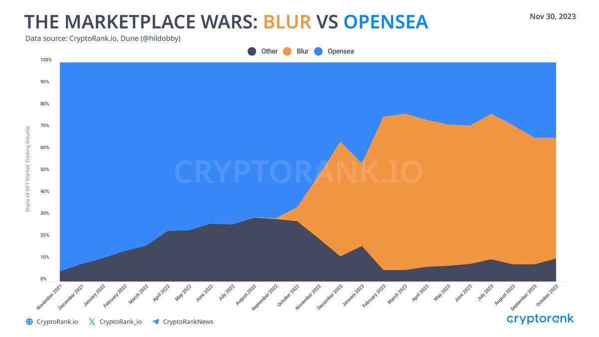 마켓플레이스 전쟁: Blur 대 OpenSea ⚔️ OpenSea의 지배력은 급격히 감소한 반면, $Blur은 무명 상태에서 등장하여 해당 분야의 선두 주자가 되었습니다. OpenSea의 시장 점유율은 2021년 11월 95%에서 34.3%로 급락한 반면 #Blur는 0에서 최고점에 66.5%로 급등했습니다. 처음에 First Mover로서 현장을 독점했던 #OpenSea는 모든 거래에 대해 엄청난 2.5%의 수수료를 부과했습니다. 또한 NFT 창작자의 권리를 '보호'하여 사용자가 컬렉션 창작자에게 또 다른 상당한 수수료를 지불하도록 강요했습니다. @blur_io는 단 6개월 만에 @OpenSea를 추월했습니다. 수수료가 없고, 아름답게 실행되는 에어드랍과 게임화 요소를 갖춘 농업으로 편리하고 기술적으로 진보된 거래를 제공합니다. 당신의 베팅은 무엇입니까? #NFT 시장에서 어떤 마켓플레이스가 1위를 차지할 것이라고 생각하시나요?