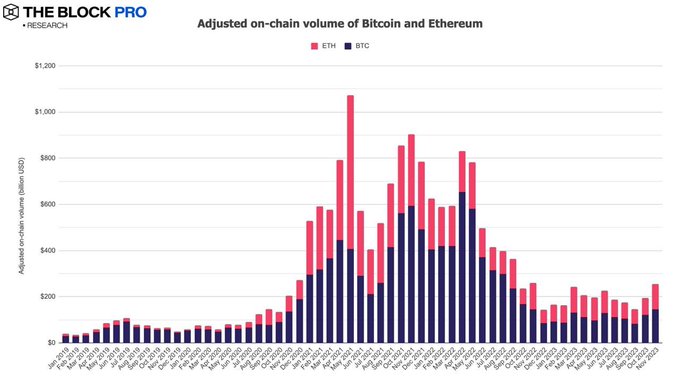 1/13 11월 요약 🧵 대부분의 지표는 지속적으로 크게 증가했습니다. 총 조정 온체인 거래량은 29.8% 증가한 2,550억 달러(BTC: +21.2%, ETH +43.9%)입니다.