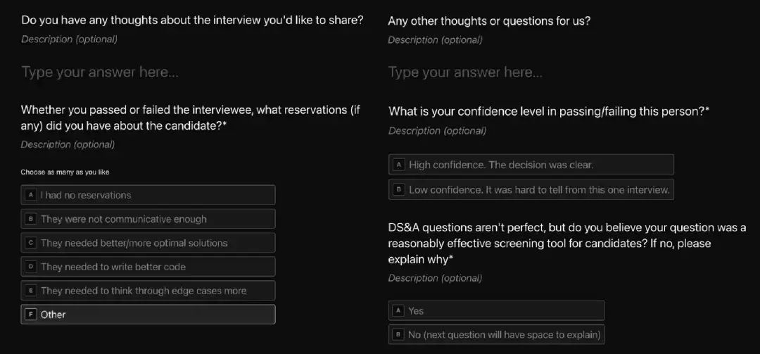 부정행위를 지적하는 이 기회 외에도 세 차례에 걸쳐 면접관에게 자유 형식의 텍스트 상자와 우려 사항을 설명하는 옵션이 있는 객관식 질문 등 다른 문제를 지적하도록 유도했습니다.