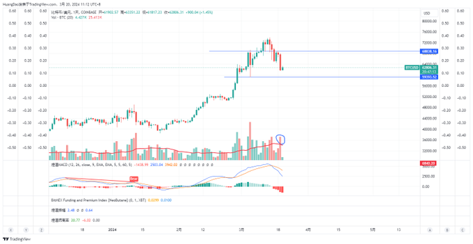3.20 BTC를 20% 할인된 가격으로 구매하시나요? 1. 이번 하락 라운드의 주요 방식은 매우 숨겨져 있습니다. 고점에서 거의 17% 하락하여 따뜻한 물에 삶은 개구리처럼 떨어졌습니다. 2. 어제의 큰 마이너스 선은 불장(Bull market) 이후 세 번째 강세 청산일이었습니다. 60,000 지역은 매우 중요한 지지선입니다. 심하게 하락하면 또한 격렬하게 반등할 것입니다. 3. 시간적, 공간적 측면에서 콜백은 아직 끝나지 않았지만 6만 부근의 반등은 여전히 참여할 가치가 있습니다.