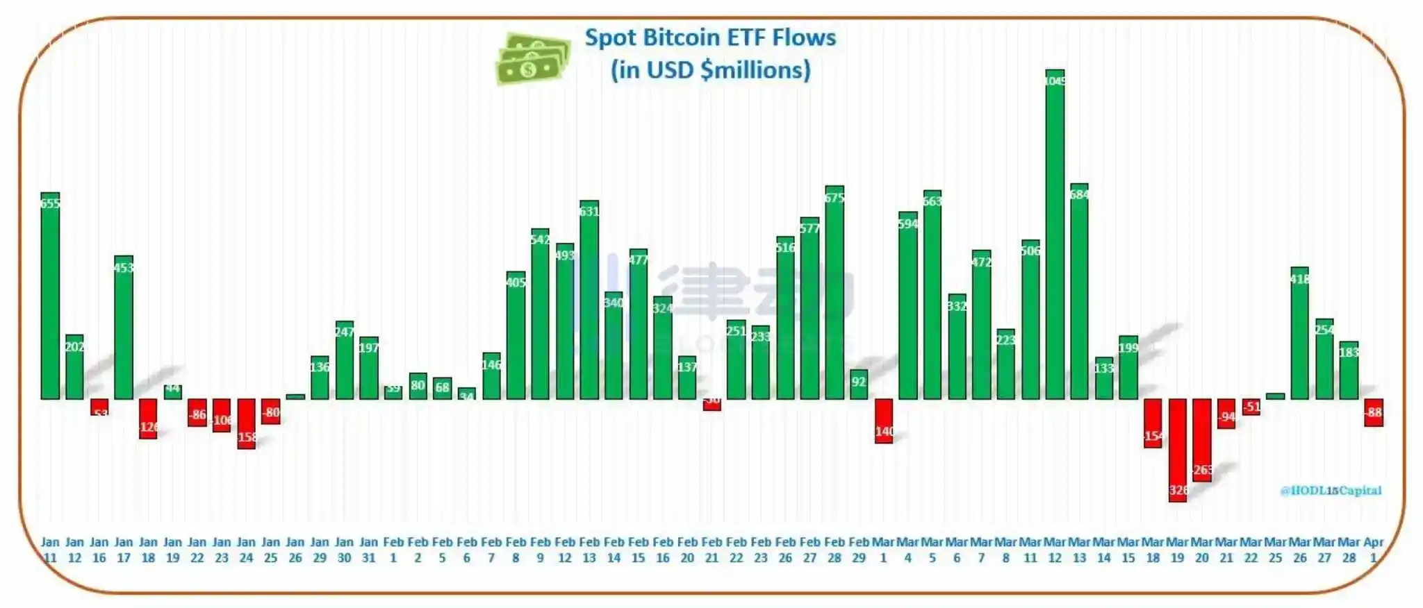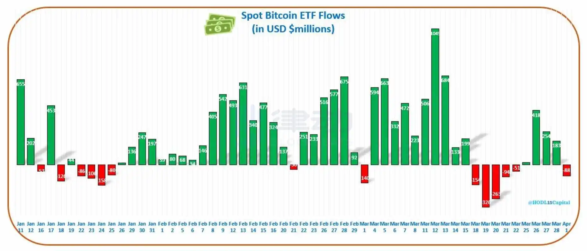 블락비츠는 4월 2일 HODL15캐피털 데이터에 따르면 어제 비트코인 현물 ETF는 전체적으로 8,800만 달러의 순유출을 보였으며, IBIT는 1억 6,400만 달러, 그레이스케일 GBTC는 3,300만 달러의 순유출을 보였다고 보도했습니다. 파사이드 인베스터스에 따르면 ARKB도 30만 달러가 유출되며 첫 순유출을 기록했습니다.