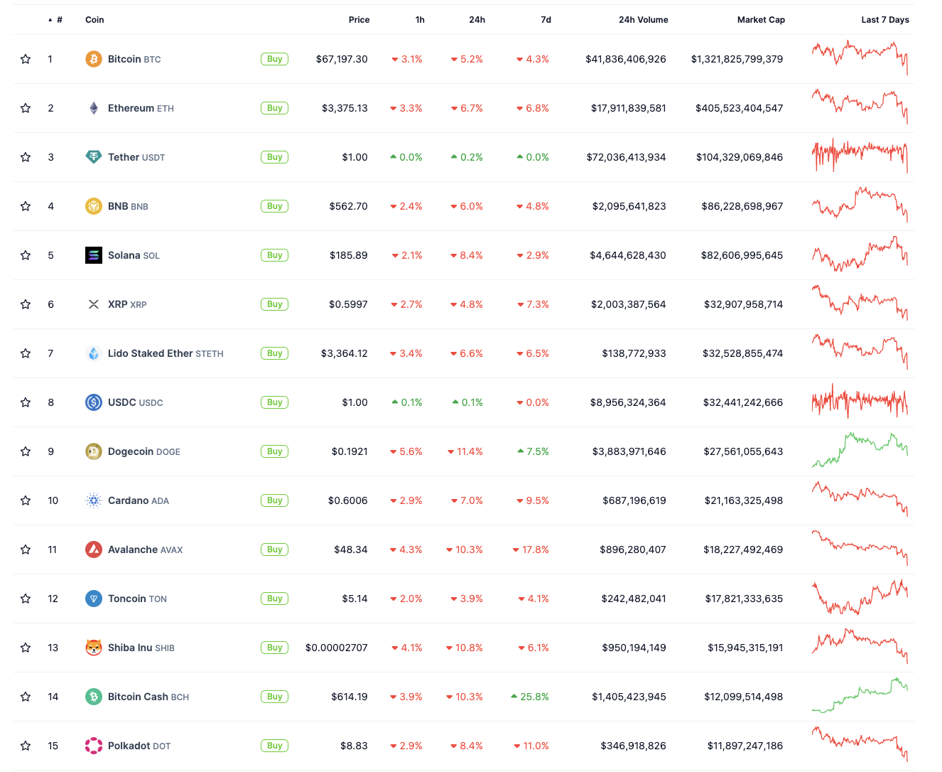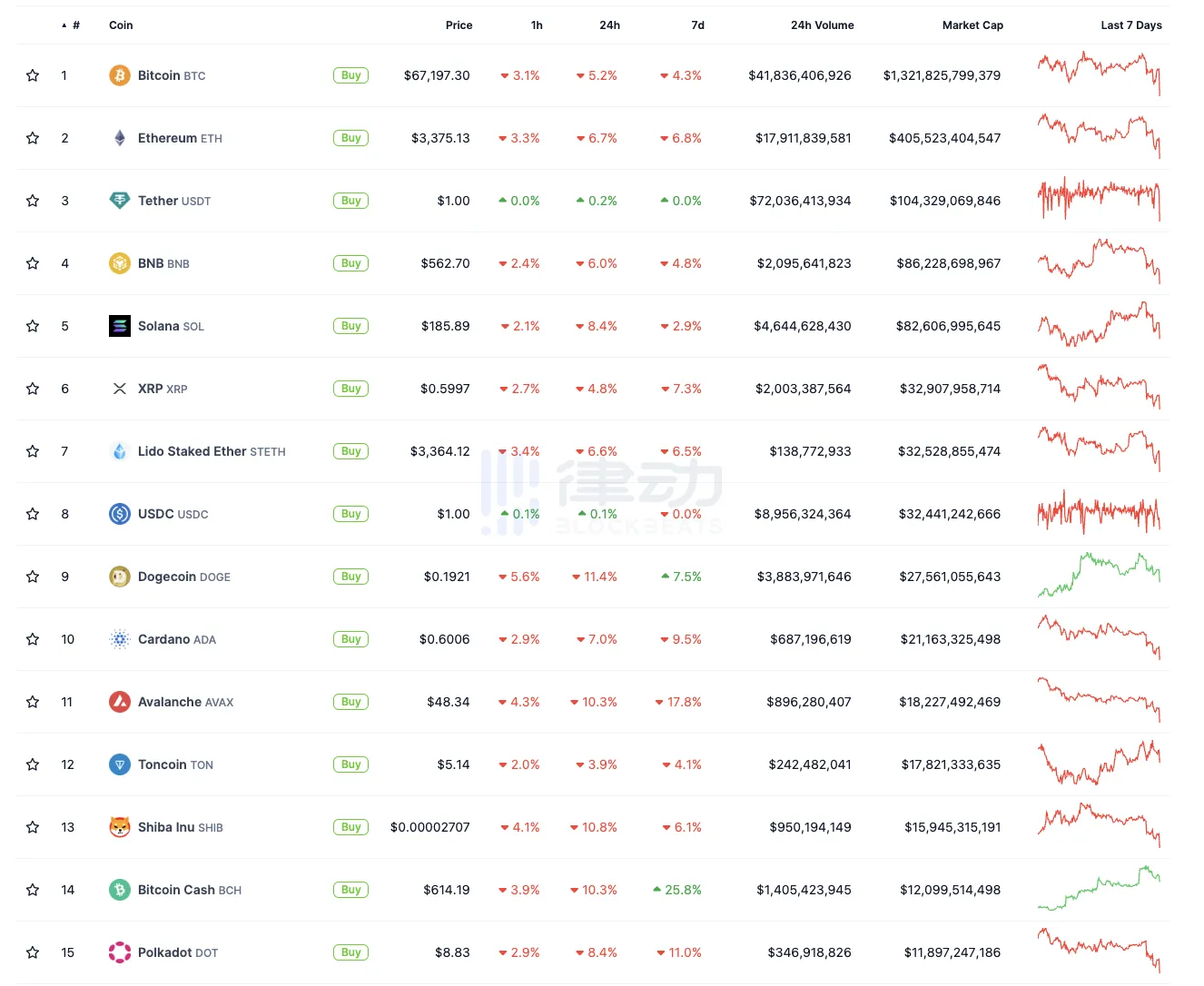 오늘 비트코인은 20분 만에 69,000달러에서 67,000달러 이하로 하락했으며, 현재 24시간 대비 5.64% 하락한 66,673달러에 거래되고 있습니다. 이더리움은 3,400달러 아래로 떨어져 현재 24시간 동안 6.91% 하락한 3,362달러에 거래되고 있으며, BNB, SOL, AVAX는 각각 7.0%, 9.1%, 10.8% 하락했습니다.