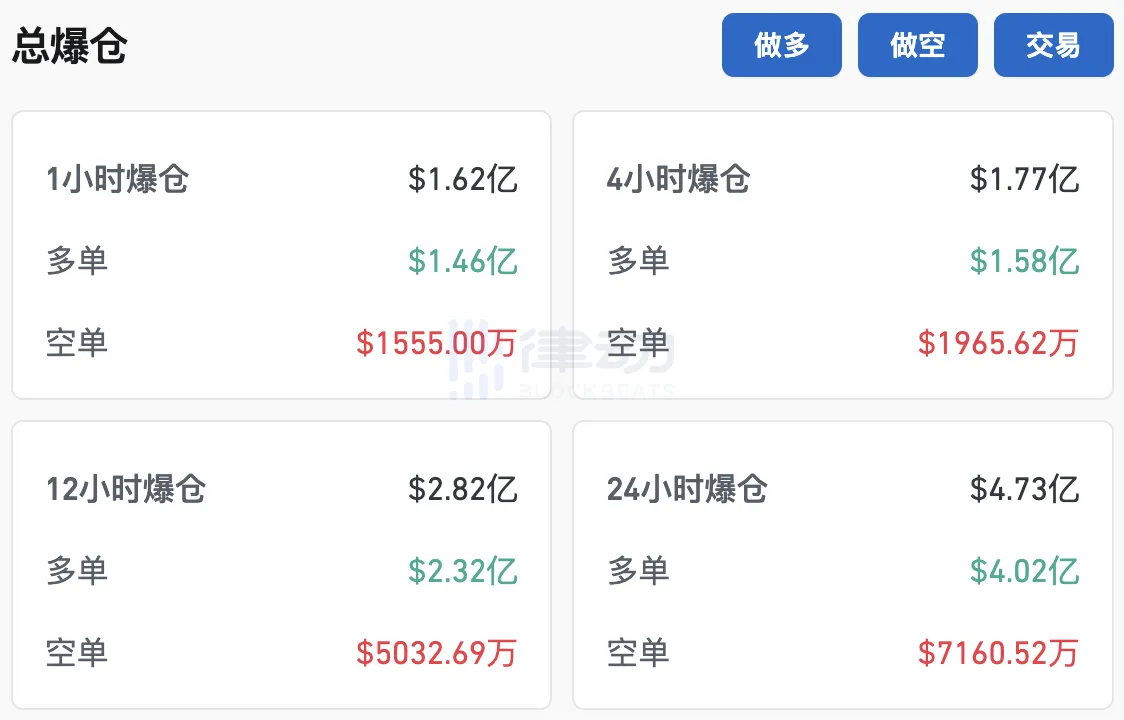 코인클래스의 데이터에 따르면 지난 한 시간 동안 전체 네트워크에서 발생한 포지션 버스트는 1억 6,200만 달러에 달하며, 이 중 1억 4,600만 달러는 다중 주문에 대한 포지션입니다. 지난 24시간 동안 발생한 4억 7,300만 달러의 미청산 포지션 중 4억 2,000만 달러가 매수 포지션이었습니다.