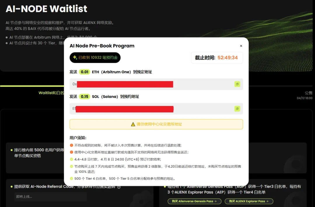 총 판매된 AI 노드 수는 50,000개로, 소매 참여자들에게 더 많은 프로젝트 배당금을 분배할 수 있습니다. ALIENX를 더욱 탈중앙화하면서 ALIENX 네트워크의 보안과 안정성 및 복원력을 더욱 강화할 수 있습니다. 현재 이미 10,000개 이상의 지갑이 노드 예약에 참여하고 있으며, 이는 ALIENX에 대한 시장의 인식을 어느 정도 반영하고 있습니다!
