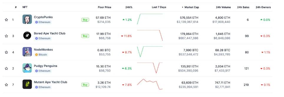 코인게코의 NFT 보드의 최신 데이터에 따르면, 지난 24시간 동안 판매된 노드몽키의 수는 80개, 24시간 거래량은 68.28 BTC(약 460만 달러), 현재 바닥 가격은 0.8 BTC(약 53,755달러)로 지난 주 대비 120% 이상 증가했으며, 총 시가총액은 5억 3700만 달러로 퍼지를 대체할 만큼 높습니다. 펭귄, 크립토펑크와 BAYC의 뒤를 잇고 있습니다.