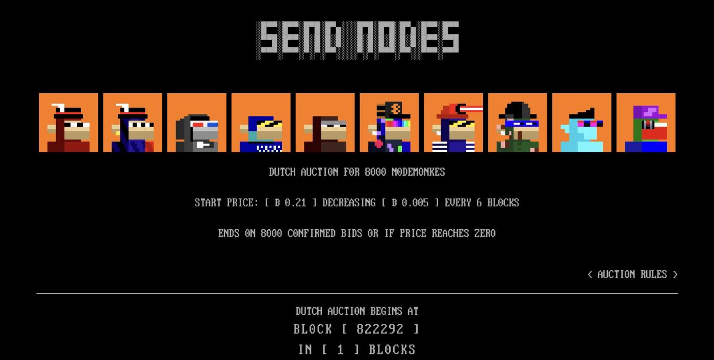 노드몬케스 판매 당시 노데토시는 0.21 BTC에서 시작하는 하강식 네덜란드 경매에서 8,000개의 NFT를 경매에 부쳤고, 약 30시간의 네덜란드 경매 끝에 가격이 0.04 BTC로 떨어지자 모두 매 진되었습니다. 남은 노몬코인 중 1,000개는 커뮤니티, 기여자, 아티스트, 개발자 등이 사용했고 나머지 1,000개는 설립자 팀이 보유하고 있으며 지갑 주소는 공개되었습니다.