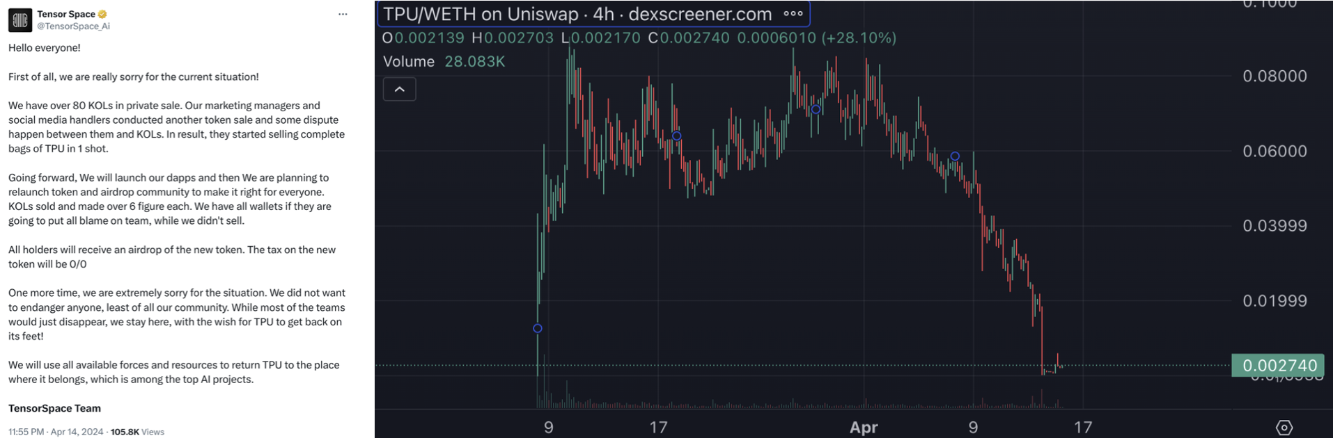 전날 고점 대비 80% 가까이 하락한 AI 프로젝트인 텐서 스페이스는 자체 토큰 TPU에 마지막 타격을 가하는 트윗을 올렸습니다.