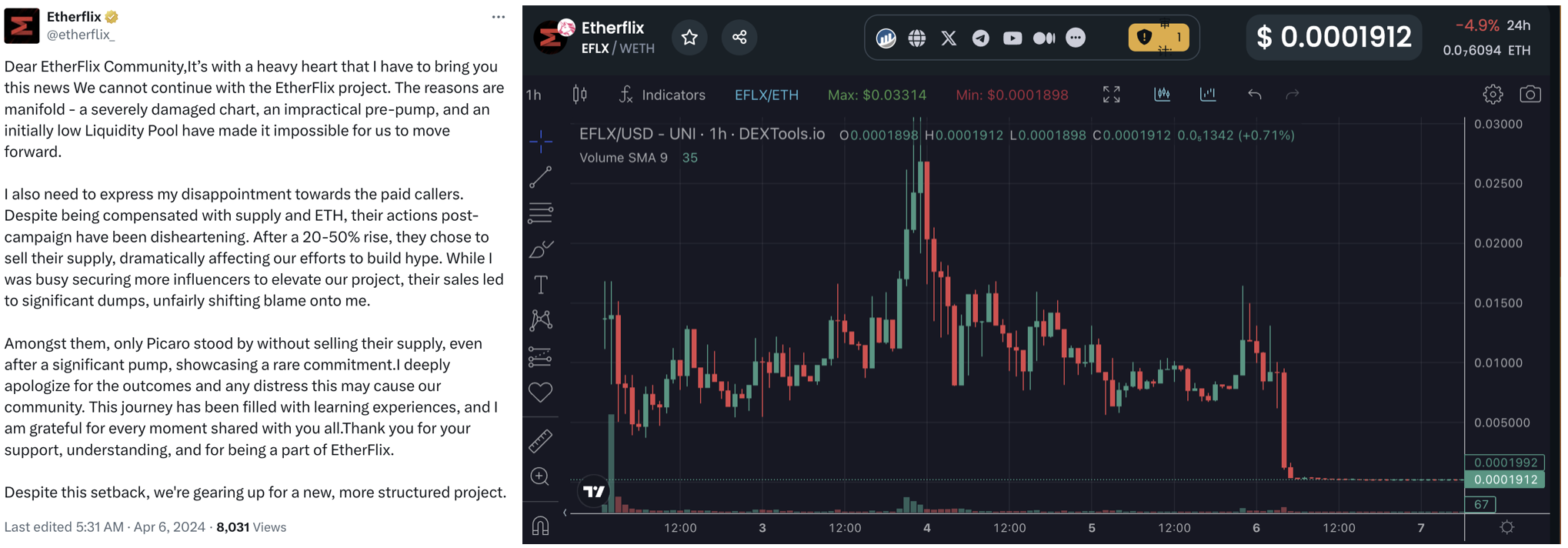 2주 전, 또 다른 AI 스트리밍 프로젝트인 이더플릭스도 '폭주 선언문'에서 프로젝트가 지속될 수 없는 이유로 KOL 토큰 판매를 꼽았습니다.