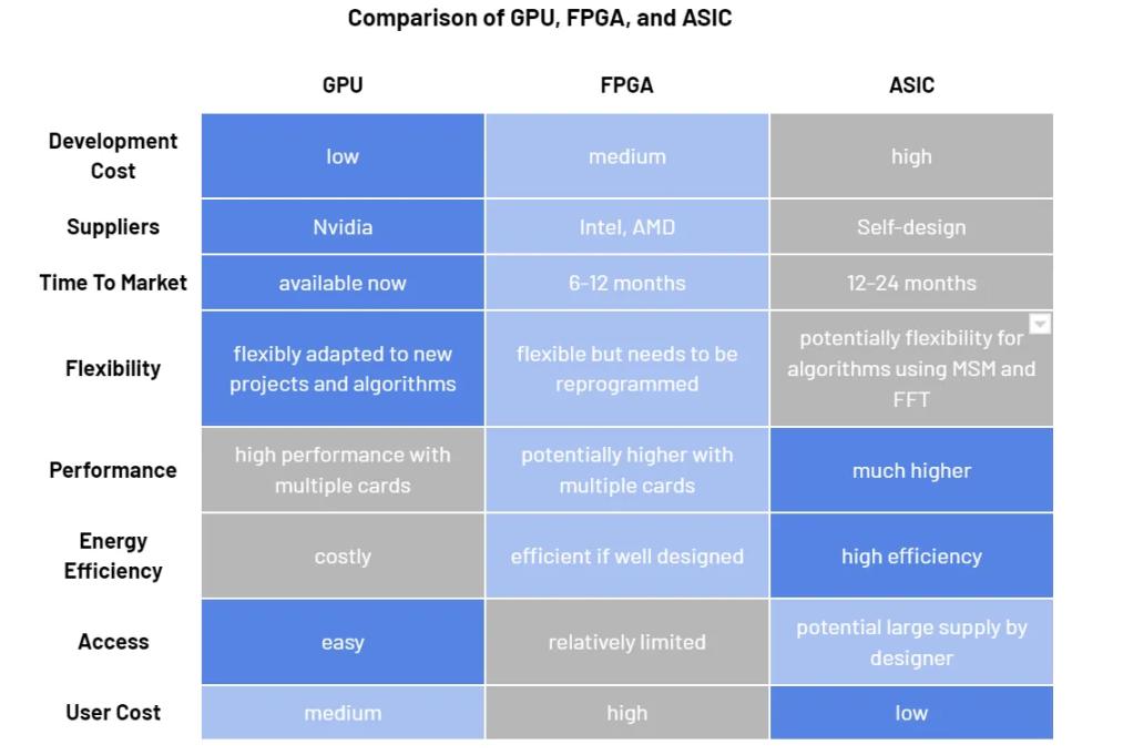 ASIC은 특정 요구 사항을 충족하도록 맞춤화된 특수 칩으로 Cysic을 포함한 ZK 하드웨어 가속 제조업체에서는 고성능과 강력한 해시레이트 최고의 솔루션으로 간주해 왔습니다. 그러나 ASIC의 업무 로직은 "한 번 작성"되며 프로그래밍할 수 없으며 특정 단일 작업만 대상으로 할 수 있으며 여러 ZK 알고리즘을 병렬로 처리할 수 없습니다. ASIC은 GPU나 FPGA에 비해 성능과 에너지 소비 측면에서 우수하지만 생산주기가 더 길다. 또한 자본 집약적인 게임인 ASIC은 생산 비용이 더 비쌉니다.