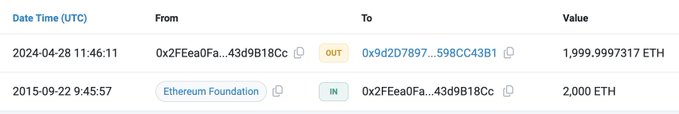 #이더리움재단 관련 지갑이 9년 만에 깨어나 2,000달러 이더리움(ETH)(665만달러)를 새 지갑으로 이체했다. 이 지갑은 2,000 $ETH를 받았습니다. 2015년 9월 22일 #이더리움 재단에서 가격이 0.9달러에 불과했을 때입니다. etherscan.io/address/0x2feea0f...…