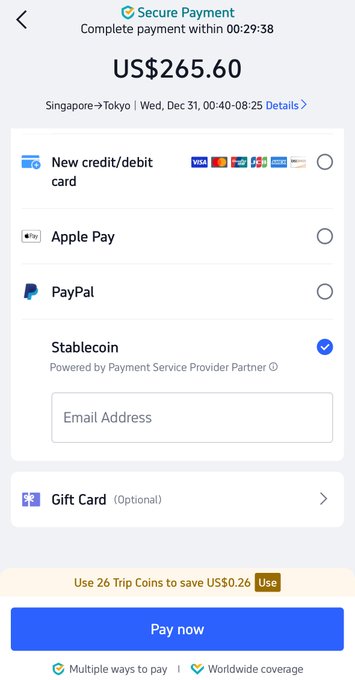 씨트립의 해외 버전인 트립닷컴이 베타 테스트 중이던 스테이블코인 결제 서비스를 정식으로 개시했습니다! 이제 스테이블코인으로 항공권과 호텔을 예약할 수 있습니다. USDT 또는 USDC 중에서 선택 가능합니다. 2026년의 핵심은 페이파이(PayFi)가 스테이블코인을 다리 삼아 모든 사람의 일상생활을 더욱 편리하게 만드는 것입니다.