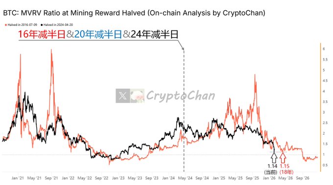 차트 하단의 지표는 "단기 비트코인 보유자의 평균 매입 가격"과 "장기 비트코인 보유자(코인 10년 이상 제외)"의 평균 매입 가격 비율입니다(즉, 노란색 선/자홍색 선).