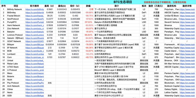 제가 이전에 정리했던 34개의 비트코인 생태계 프로젝트 중, Mezo(토큰 출시 예정)를 포함하면 자체 토큰을 발행한 프로젝트는 16개에 불과하여, 겨우 과반수를 차지하고 있습니다. 나머지 프로젝트들은 매우 조용합니다.