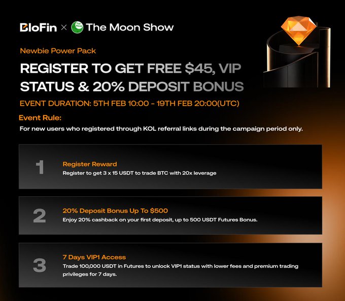 문 (Moon/가격 상승을 의미) 쇼 x 블로핀 💸 지금 가입하시면 $45 무료 크레딧, VIP 혜택, 그리고 20% 입금 보너스를 받으실 수 있습니다. 🗓 2월 5일부터 2월 19일까지 ❶ 3 x 15 테더 USDT(USDT) 로 20배 레버리지를 사용하여 비트코인(BTC) 거래 ❷ 20% 입금 보너스, 최대 500달러 선물 거래 보너스 ❸ 7일간의 VIP1 이용권 🔗 themoon.co/blofin45usdt