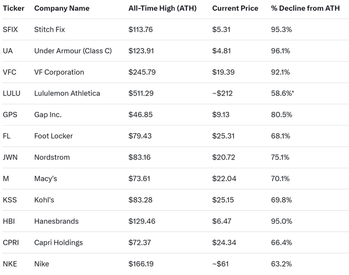 암호화폐 시장 상황이 나쁘다고 생각했다면, 소매/의류 주식은 훨씬 더 나빴을 겁니다. 유명 브랜드 주식이 60~90% 폭락했습니다.