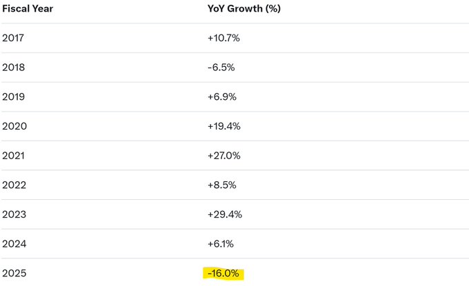 $NKE의 탄광 속 카나리아는 조던 신발이었습니다. 7년 만에 처음으로 매출이 감소했고, 10년 만에 처음으로 두 자릿수 매출 성장률 하락을 기록했습니다. 내부자들은 아마도 2026년에는 상황이 더 나빠지지 않을 것이라고 예상하고 매수했을 것입니다.