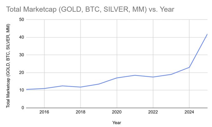 지금 가장 많은 자금이 몰린 거래는 미국 달러에 대한 헤지 또는 달러 가치 하락에 베팅하는 것이라고 볼 수 있습니다. 사상 최대 규모인 46조 달러 이상이 달러 하락에 베팅하고 있습니다. 금 - 올해 사상 최고치 경신 은 - 올해 사상 최고치 경신 비트코인 - 올해 사상 최고치 경신 머니마켓 - 사상 최고치 경신