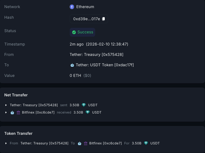 테더(Tether) 방금 35억 달러(약 35억 원)를 비트파이넥스(Bitfinex) 로 이체했습니다.