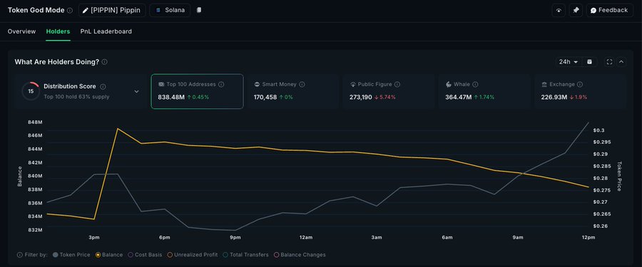 $PIPPIN이 지난 24시간 동안 17.23% 상승한 이유에 대한 숏 홀더 분석. 🔝 상위 100개 주소: +0.45% 👔 공인 수치: -5.74% 🐳 고래: +1.74% 🏦 외환 유출액: 1.9%