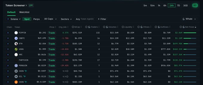 🐳 지난 24시간 동안 솔라나(Solana) 그물에 포착된 고래: - $PIPPIN는 2백만 달러의 순유입을 기록했습니다. - $ARC 여전히 조용한 축적이 관찰되었습니다. - $PENGUIN와 $FARTCOIN는 규모는 작지만 주목할 만한 입찰을 포착했습니다. 고래들이 먹이를 고르는 동안 밈들이 시험대에 오르고 있다.