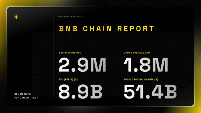 바이낸스 코인(BNB) 체인의 한 주간 실적 요약: 🔸 평균 일일 활성 사용자 수 480만 명 이상 (BSC 및 opBNB 포함) 🔸 89억 달러 이상의 Total Value Locked(TVL) 🔸 거래량 514억 달러 이상 전체 업데이트 내용을 확인하세요 👇 bnbchain.org/en/blog/bnb-chain...…