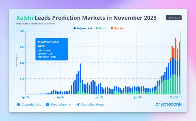 • @Kalshi: "예측 시장의 코인베이스"는 완전 규제를 받고 있으며, 미국을 중심으로 운영되고, 거시경제와 경제에 중점을 두고 있습니다. 110억 달러의 기업 가치로 10억 달러를 모금했지만, 이제 미국으로 다시 진출하는 Polymarket과 직접적인 경쟁에 직면해 있습니다.