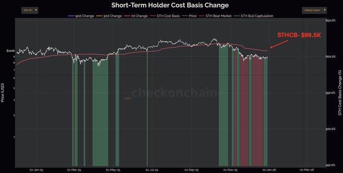 비트코인의 단기 홀더 매입 단가가 공식적으로 10만 달러 미만인 9만 9,500달러를 기록했습니다. 저는 STHCB가 2026년 1분기 중에 재검사될 것으로 예상합니다.
