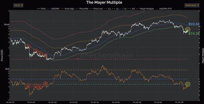 비트코인 강세론자들은 가격이 마이어 멀티플의 저점인 74,300달러 이상을 유지하기를 바랄 것입니다. 만약 그렇게 하지 못한다면 지난번 약세장과 유사한 상황이 벌어질 것입니다.