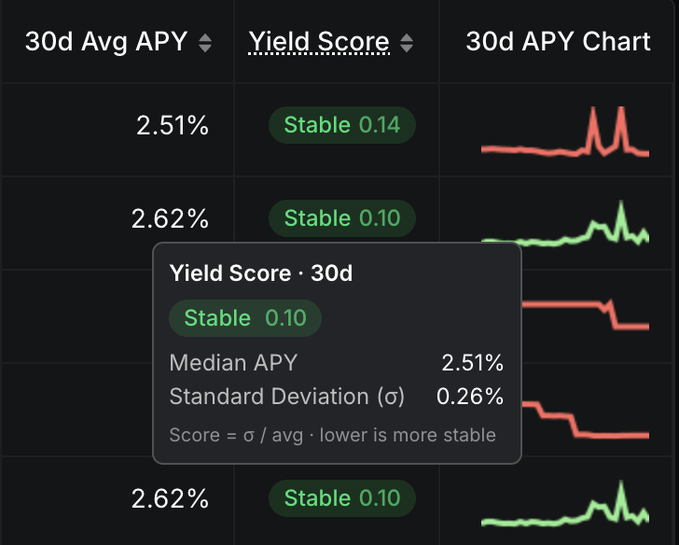 수익률 대시보드가 더욱 스마트해졌습니다. 이제 풀에 수익률 점수(변동 계수)가 포함됩니다. 이 점수는 수익률이 안정적인지, 아니면 단기적인 급등으로 인해 부풀려졌는지 측정합니다. 수익률 점수를 다음과 같이 활용할 수 있습니다. > 개별 풀의 신뢰성 평가 > 여러 풀의 안정성 비교