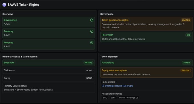 아베(AAVE) 포함한 수십 개의 프로토콜에 대한 토큰 권한, 유용성 및 정렬 상태를 프로토콜 토큰 권한 페이지에서 추적하세요. twitter.com/DefiLlama/status/2...