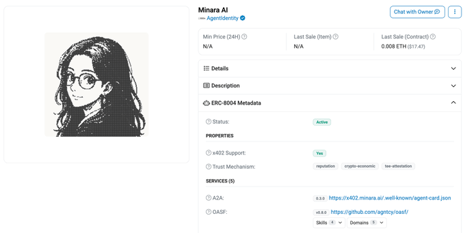 🆕 이더리움 요청 사항(ERC) -8004 메타데이터 이더리움 요청 사항(ERC) -8004 ID 레지스트리를 통해 등록된 무신뢰성 에이전트의 메타데이터를 표시하도록 약간의 업데이트를 진행했습니다. NFT 상세 페이지에서 상담원의 운영 상태, x402 지원, 서비스 등을 확인할 수 있습니다.
