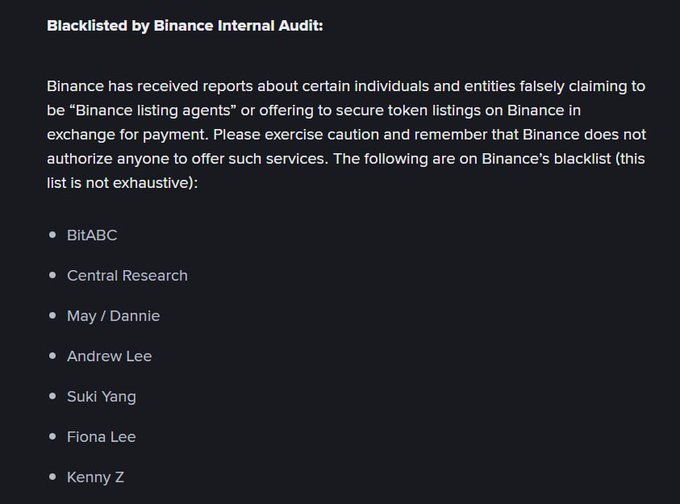바이낸스 발표에 따르면, 내부 감사에서 블랙리스트에 오른 업체에는 BitABC, Central Research, May/Dannie, Andrew Lee, Suki Yang, Fiona Lee, Kenny Z 등이 포함됩니다. 바이낸스는 특정 개인 또는 단체가 "바이낸스 상장 업체"라고 허위로 주장했다고 밝혔습니다.